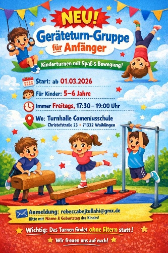Ab 01.03.2026 gibt es in der Turnhalle Comeniusschule eine neue Gruppe für Anfänger im Alter von 5 und 6 Jahren.
